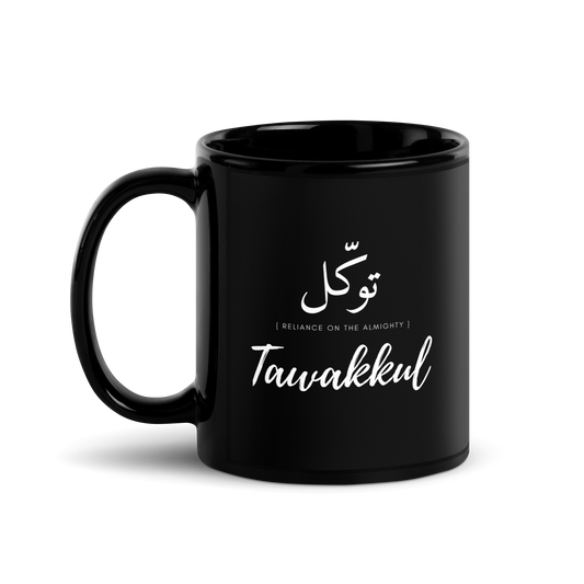 MUG Glossy Black - TAWAKKUL (RELIANCE) Arabic/English - White