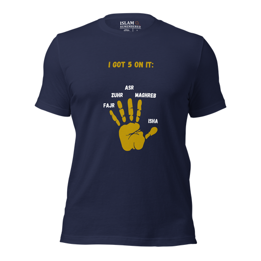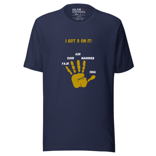 Introducing the "I GOT 5 ON IT" collection – your daily reminder that you've got a prayer for every occasion and then some! With this attire, you won't just be counting dollars; you'll be counting down to the next prayer. It's not just a catchy slogan; it's a declaration that you've got your spiritual schedule locked and loaded. Who needs a clock when you've got the five daily prayers keeping you in check? So, set those alarms, grab your "I GOT 5 ON IT" gear, and show the world that your prayer game is strong and on point, five times a day, every day!