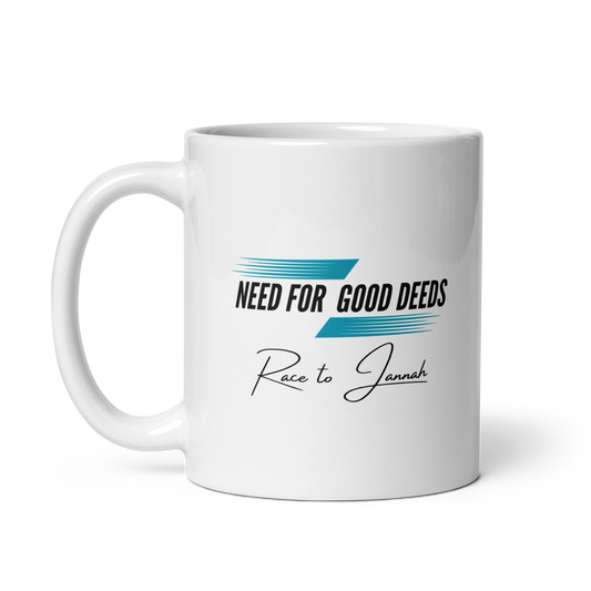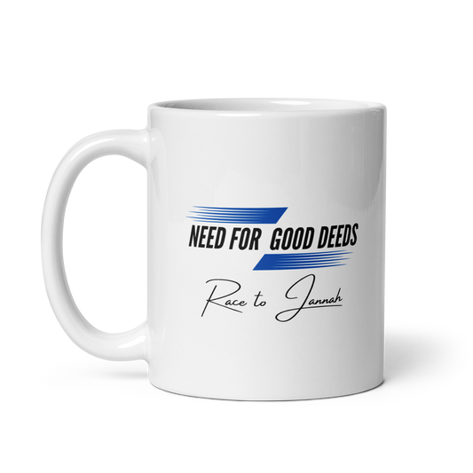 MUG Glossy White - NEED FOR GOOD DEEDS - Black/Blue