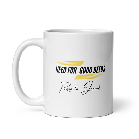 MUG Glossy White - NEED FOR GOOD DEEDS - Black/Yellow